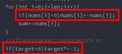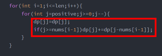 public:bool canPartition(vector& nums) {int sum=0;int maxNum=INT_MIN;for(int i=0;itarget)return false;vector dp(target+1) ;for(int j=1;j<=target;j++){if(j-nums[0]>=0)dp[j]=nums[0];}for(int i=1;i<=len-1;i++){for(int j=sum;j>=0;j--){if(j-nums[i]>=0)dp[j]=max(dp[j],dp[j-nums[i]]+nums[i]);else dp[j]=dp[j];}}return dp[sum]==sum;}