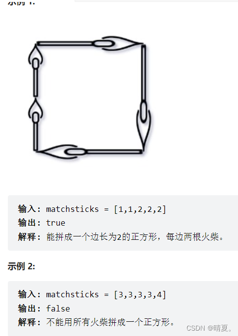 你将得到一个整数数组 matchsticks ,其中 matchsticks[i] 是第 i 个火柴棒的长度。你要用 所有的火柴棍 拼成一个正方形。你 不能折断 任何一根火柴棒,但你可以把它们连在一起,而且每根火柴棒必须 使用一次 。