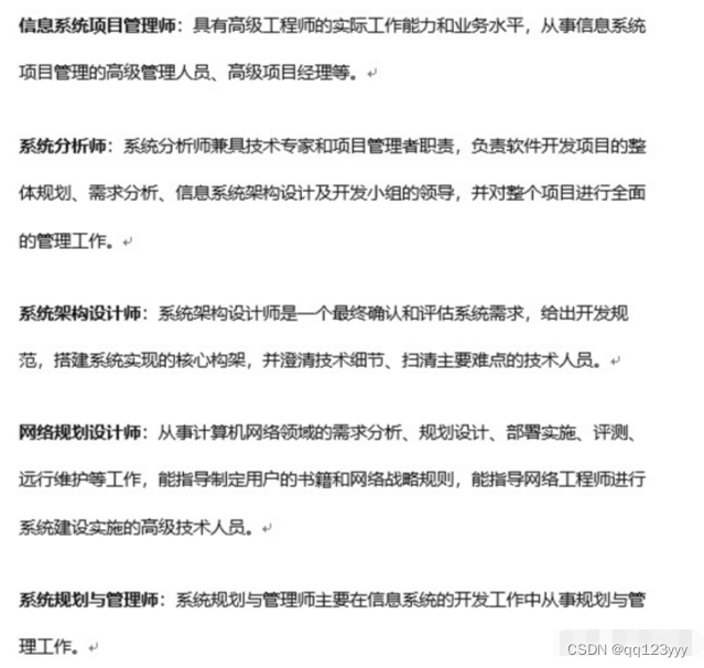 软考高级科目有:信息系统项目管理师、系统分析师、系统架构设计师、网络规划师、系统规划与管理师。如下: