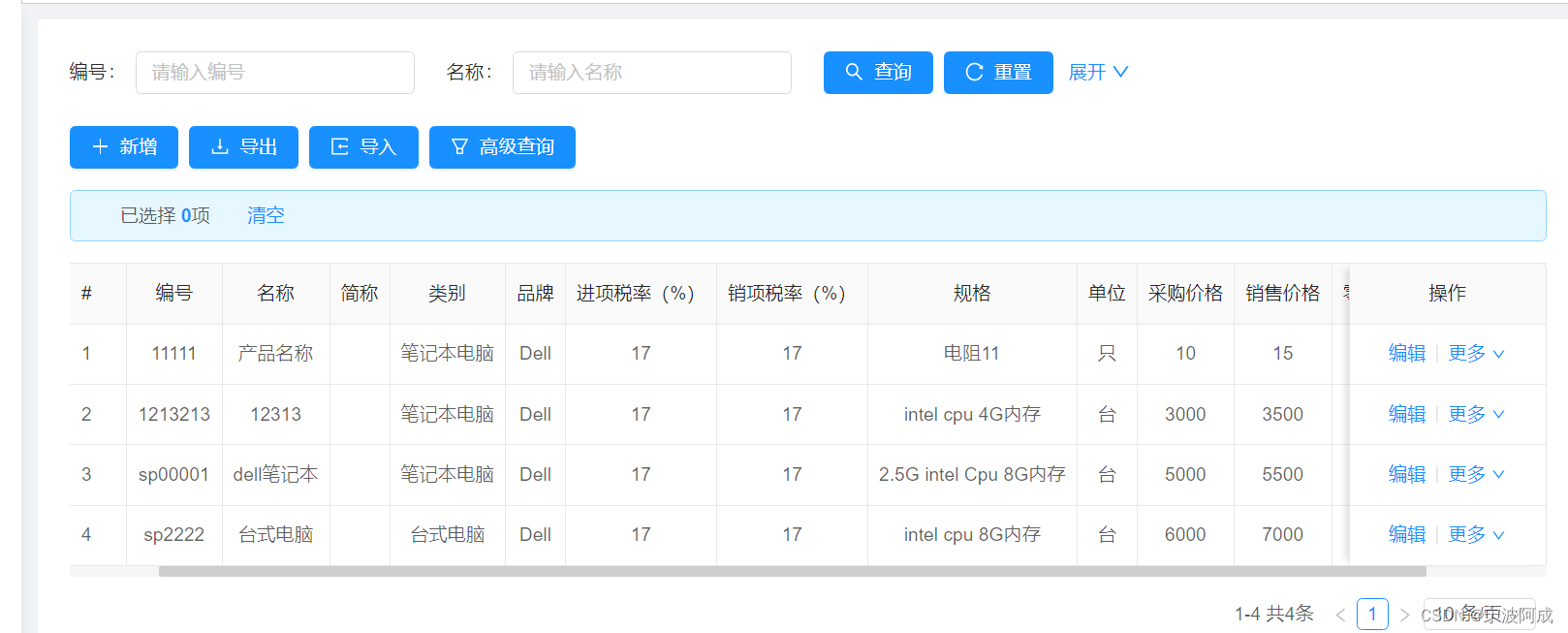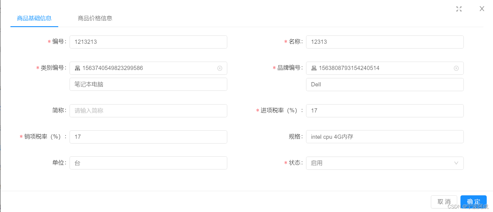 public class ErpGoodsDto implements Serializable {private static final long serialVersionUID = 1L;/**ID*/private java.lang.String id;/**编号*/private java.lang.String code;/**名称*/private java.lang.String name;/**SPU编号*///private java.lang.String spuId;/**类别编号*/private java.lang.String categoryId;/**类别名称*/private java.lang.String categoryName;/**品牌编号*/private java.lang.String brandId;/**品牌名称*/private java.lang.String brandName;/**规格*/private java.lang.String spec;/**单位*/private java.lang.String unit;/**采购价格*/private java.math.BigDecimal purchasePrice;/**销售价格*/private java.math.BigDecimal salePrice;/**零售价格*/private java.math.BigDecimal retailPrice;/**税率(%)*/private java.math.BigDecimal taxRate;/**销项税率(%)*/private java.math.BigDecimal saleTaxRate;/**数量*/private java.lang.Integer num;/**总价格*/private java.math.BigDecimal totalPrice;/**库存数量*/private java.lang.Integer stockNum;@Dict(dicCode = "erp_status")@ApiModelProperty(value = "状态")private java.lang.Integer status;}