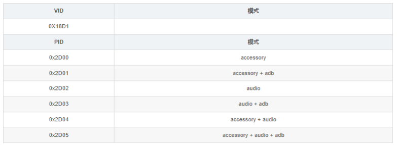 判断 Android 设备处于 Accessory Mode 时,VID 和 PID 值必须满足如下条件如下: