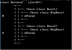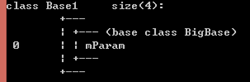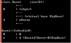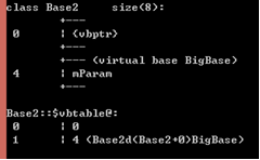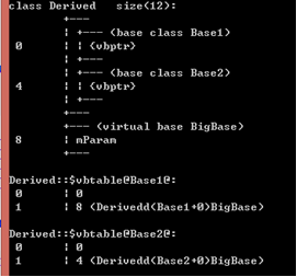 Base1和Base2通过虚继承的方式派生自BigBase,这两个对象的布局图中可以看出编译器为我们的对象中增加了一个vbptr (virtual base pointer),vbptr指向了一张表,这张表保存了当前的虚指针相对于虚基类的首地址的偏移量。