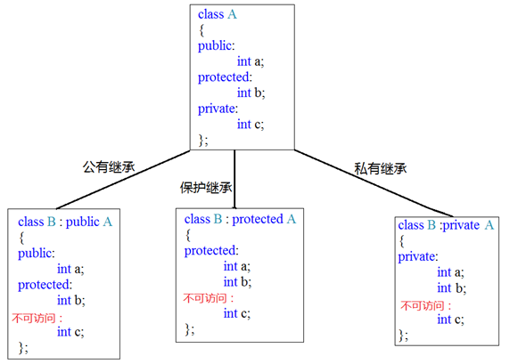 class SubC : public C{void PrintSubC(){//cout << mA << endl; //不可访问基类public属性//cout << mB << endl; //不可访问基类protected属性//cout << mC << endl; //不可访问基类private属性}