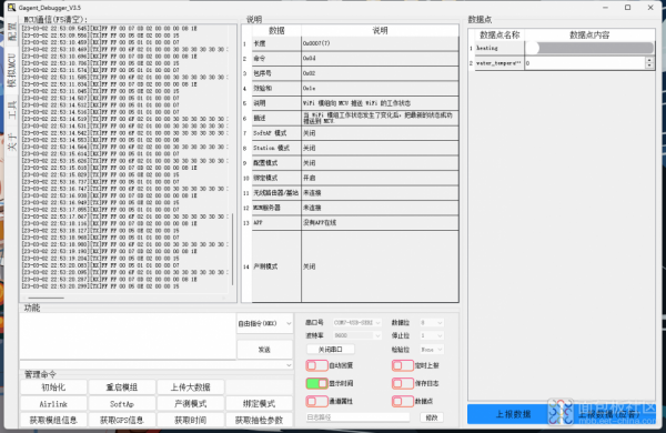 然后要介绍一下机智云的串口调试助手,这是一个功能很全面,使用很方便的工具,简单介绍一下它在项目开发中的作用:
