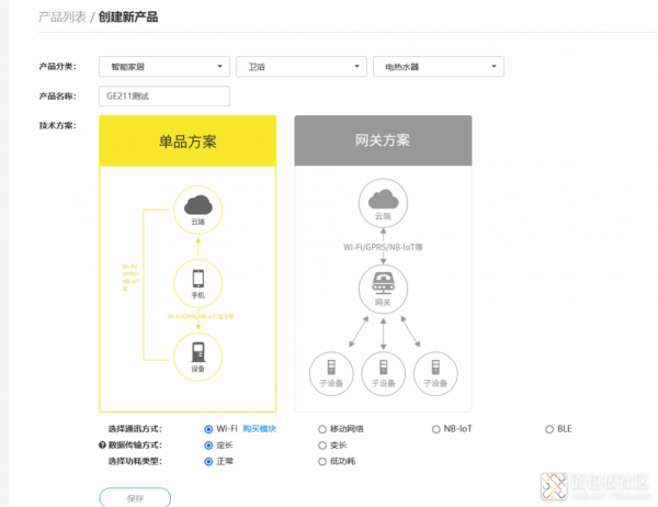 然后就可以创建产品,如果你有用过阿里云或者别的云平台,这些步骤做起来还是很熟悉的,如果你是初次接触IoT开发,跟随机智云官方文档的指引也能够很轻松的操作,机智云平台整体的浏览和使用感觉比阿里云简洁一点,指引文档也好用一点。官方教程。