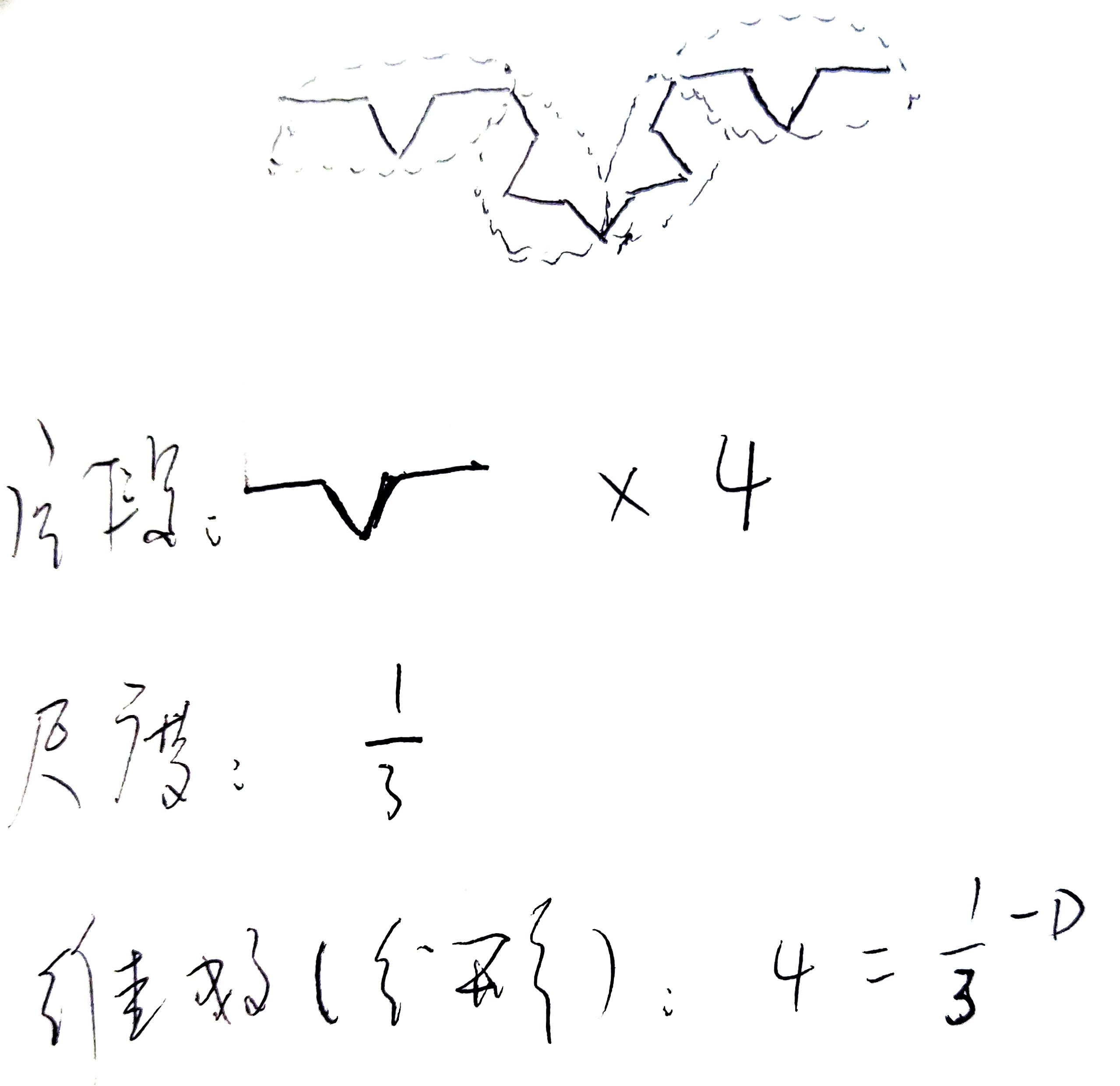 也就是说,对于由下式描述的分形 ε=13\varepsilon ={\tfrac {1}{3}}ε=31 时,N=4N=4N=4,例如 Koch snowflake,D=1.26185…D=1.26185\ldotsD=1.26185…,一个非整数值,表明分形的维数不等于它所在的空间。