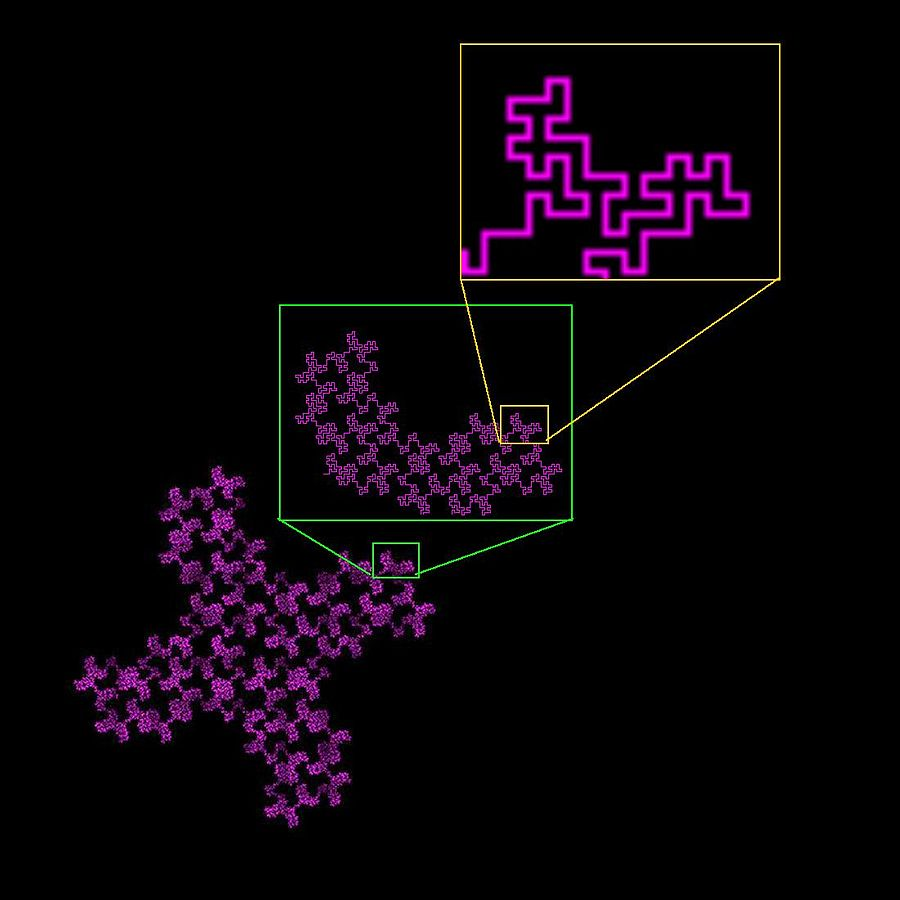 局部和全局的不规则性,除了递归定义的阶段序列的限制外,不能用传统的欧几里德几何语言轻易描述。 对于分形图案的图像,这已通过诸如“平滑地堆积表面”和“漩涡上的漩涡”等短语表达。