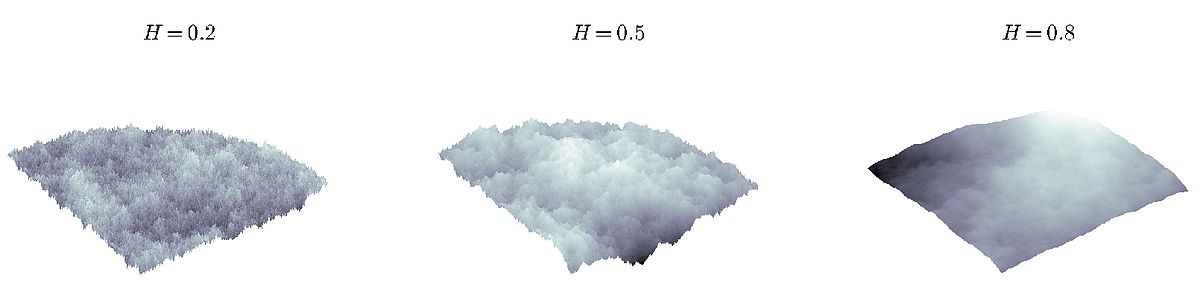有效生成分数布朗曲面提出了重大挑战。由于布朗曲面表示具有非平稳协方差函数的高斯过程,因此可以使用 Cholesky decomposition。一种更有效的方法是 Stein method,它使用循环嵌入方法(circulant embedding approach)生成辅助平稳高斯过程(auxiliary stationary Gaussian process),然后调整该辅助过程以获得所需的非平稳高斯过程。下图显示了不同粗糙度或 Hurst 的分数布朗曲面的三种典型实现。Hurst 参数始终介于 0 和 1 之间,值越接近 1,表面越光滑。这些表面是使用 Stein method 的 Matlab 实现生成的。