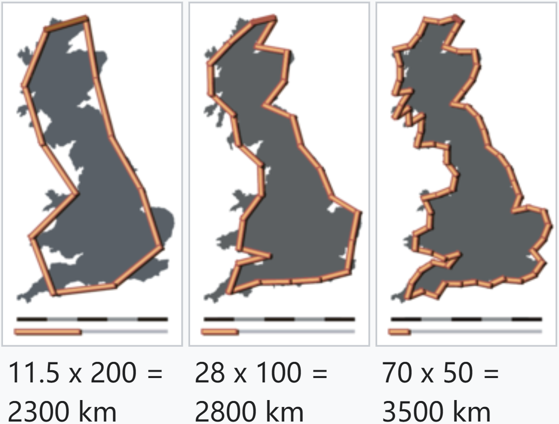 这也导致理解第三个特征,即作为数学方程的分形是“无处可微”的。在具体意义上,这意味着分形无法以传统方式测量。详细地说,在试图找到波浪非分形曲线的长度时,可以找到一些足够小的测量工具的直段,以端到端地放置在波浪上,这些段可以变得足够小以被认为符合用卷尺测量的正常方式的曲线。但是在测量像 Koch curve 这样的无限“摇摆”的分形曲线时,永远找不到足够小的直段来符合曲线,因为锯齿状的图案总是会以任意小的尺度重新出现,本质上会拉一点 每次尝试将卷尺越来越紧地贴合曲线时,将更多的卷尺计入总长度。结果是必须需要无限大的胶带才能完美地覆盖整个曲线,即雪花的周长是无限大的。