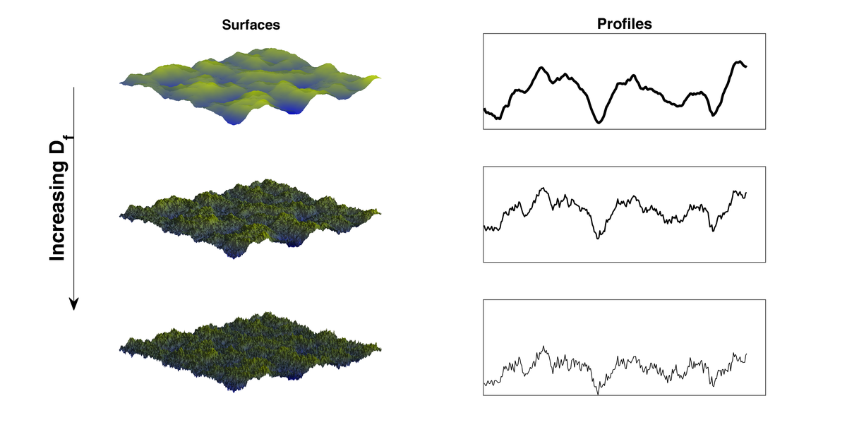分形的概念越来越多地应用于表面科学领域,在表面特性和功能特性之间架起了一座桥梁。许多表面描述符用于解释名义上平坦表面的结构,这些表面通常在多个长度尺度上表现出自仿射特征(self-affine features)。平均表面粗糙度,通常表示为 RAR_{\mathrm{A}}RA,是最常用的表面描述符,但是许多其他描述符包括平均斜率、均方根粗糙度(root mean square roughness,RRMSR_{\mathrm{RMS}}RRMS)。然而,人们发现许多物理表面现象不能很容易地参照此类描述符来解释,因此分形维数越来越多地应用于建立表面结构在缩放行为和性能方面的相关性。表面的分形维数已被用来解释和更好地理解接触力学领域的现象,摩擦行为,电接触电阻和透明导电氧化物。