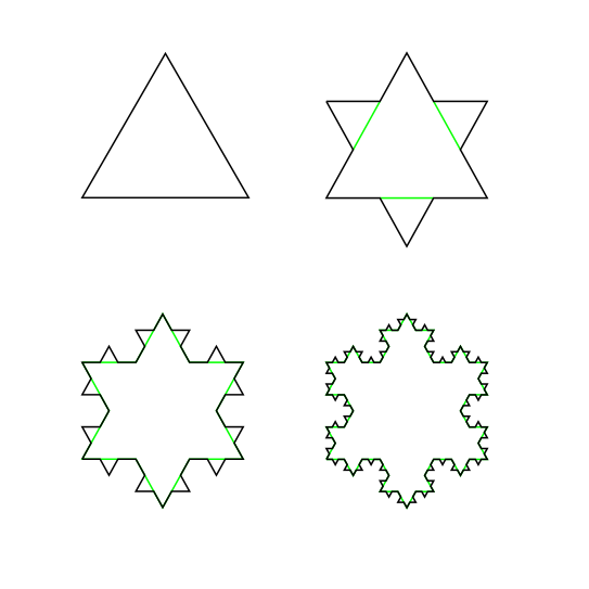 与拓扑维度不同,分形指数可以采用非整数值,表明一个集合在定性和定量上填充其空间的方式不同于普通几何集合。例如,分形维数非常接近 1(比如 1.10)的曲线表现得非常像一条普通直线,但分形维数为 1.9 的曲线在空间中蜿蜒曲折,非常接近于一个曲面。类似地,分形维数为 2.1 的表面非常像普通表面一样填充空间,但分形维数为 2.9 的表面几乎像一个体积一样折叠和流动以填充空间。这种一般关系 可以在上图的分形曲线图像中看到——32 段轮廓,回旋和空间填充,具有 1.67 的分形维数,相比之下明显不太复杂的 Koch curve,如下图,其分形维数约为 1.2619: