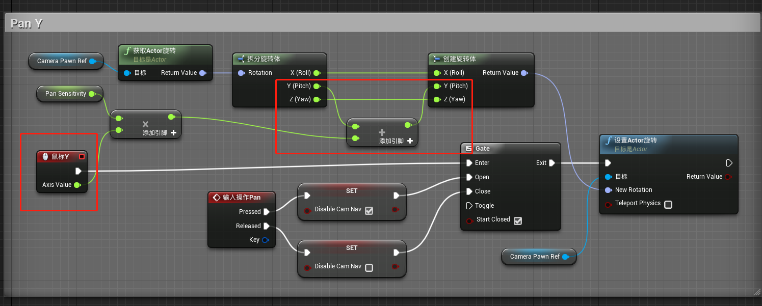 当按下鼠标中键时,设置“CameraPawn”无法移动。把鼠标X的值与旋转灵敏度相乘再加上“CameraPawn”当前的Z轴的旋转值,将这个旋转值结果重新赋给“CameraPawn”的旋转。