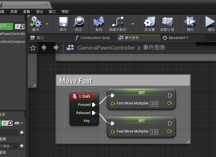 1. 如果我们想按住shift来加速移动“CameraPawn”,可以添加如下节点
