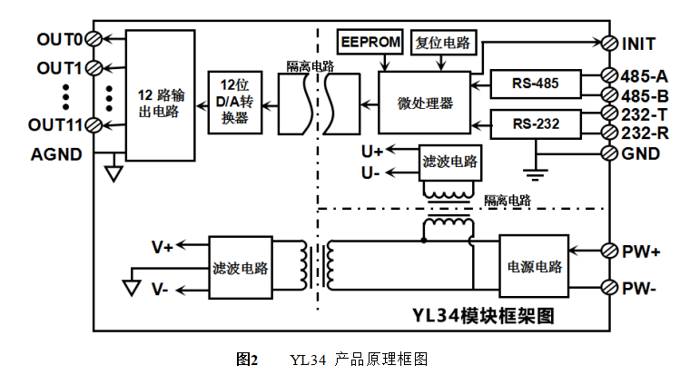 YL34 信号隔离D/A转换模块,可以用来输出12路共地的电流或电压信号。