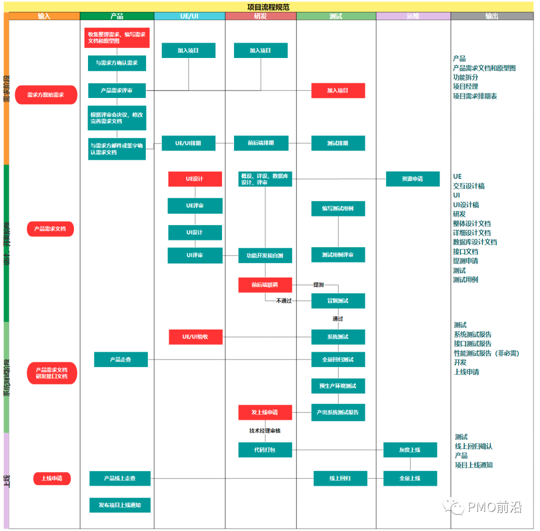 项目流程指的是项目工作的执行顺序,告诉项目成员先做什么再做什么,让项目的成功可以复制。项目执行不好首要考虑的是流程问题,比如IT项目的阶段可以分成需求阶段、开发阶段、测试阶段、发布阶段,每个阶段有对应的流程事项,事项和事项之间又有依赖关系,先完成A才能做B,如果B做的不好可以往上一步去分析,看哪里做得不好,是否要增加流程。比如在测试阶段测出很多BUG影响进度,就可以往前一步去看开发质量的问题,开发人员是怎么做的,有没有代码自测和代码评审环节,根据情况进行完善。
