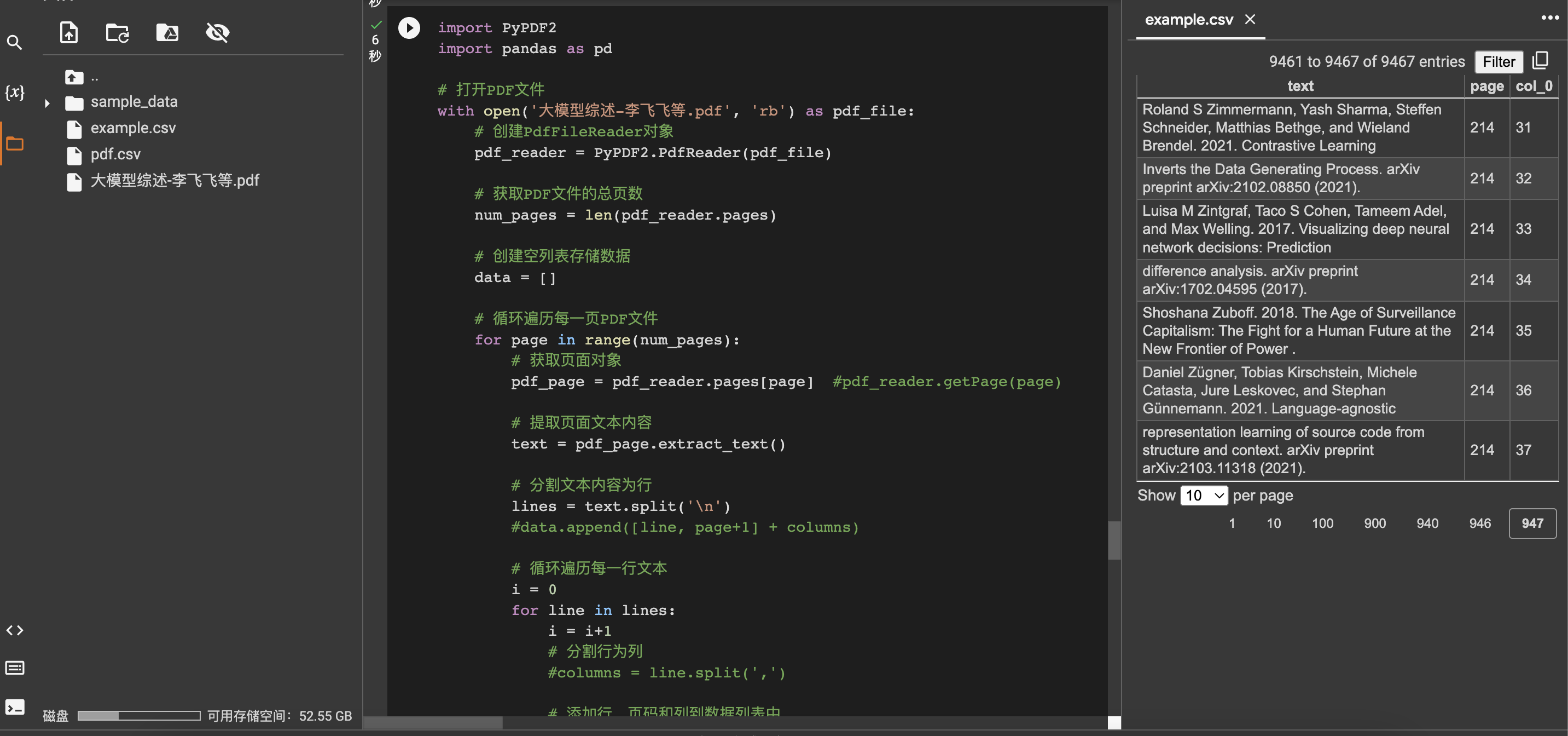 with open('大模型综述-李飞飞等.pdf', 'rb') as pdf_file:# 创建PdfFileReader对象pdf_reader = PyPDF2.PdfReader(pdf_file)# 获取PDF文件的总页数num_pages = len(pdf_reader.pages)# 创建空列表存储数据data = []# 循环遍历每一页PDF文件for page in range(num_pages):# 获取页面对象pdf_page = pdf_reader.pages[page] #pdf_reader.getPage(page)# 提取页面文本内容text = pdf_page.extract_text()# 分割文本内容为行lines = text.split('\n')#data.append([line, page+1] + columns)# 循环遍历每一行文本i = 0for line in lines:i = i+1# 分割行为列#columns = line.split(',')# 添加行、页码和列到数据列表中data.append([line, page+1, i])# 将数据列表转换为Pandas DataFrame对象