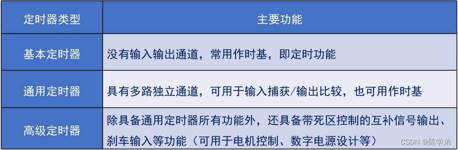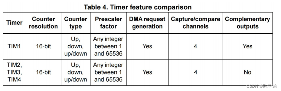 1) 16 位向上、向下、向上/向下自动装载计数器( TIMx_CNT)。 2) 16 位可编程(可以实时修改)预分频器(TIMx_PSC),计数器时钟频率的分频系数为 1~65535 之间的 任意数值。 3)4 个独立通道( TIMx_CH1~4),这些通道可以用来作为: A.输入捕获 B.输出比较 C.PWM 生成(边缘或中间对齐模式) D.单脉冲模式输出 4)可使用外部信号( TIMx_ETR)控制定时器和定时器互连(可以用 1 个定时器控制另外一个定时器) 的同步电路。 5)如下事件发生时产生中断/DMA: A.更新:计数器向上溢出/向下溢出,计数器初始化(通过软件或者内部/外部触发) B.触发事件(计数器启动、停止、初始化或者由内部/外部触发计数) C.输入捕获 D.输出比较 E.支持针对定位的增量(正交)编码器和霍尔传感器电路 F.触发输入作为外部时钟或者按周期的电流管理