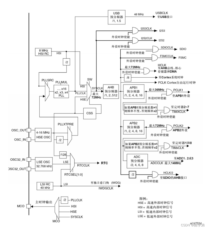 {RCC_OscInitTypeDef RCC_OscInitStruct = {0};RCC_ClkInitTypeDef RCC_ClkInitStruct = {0};/** Initializes the RCC Oscillators according to the specified parameters* in the RCC_OscInitTypeDef structure.*/RCC_OscInitStruct.OscillatorType = RCC_OSCILLATORTYPE_HSE;RCC_OscInitStruct.HSEState = RCC_HSE_ON;RCC_OscInitStruct.HSEPredivValue = RCC_HSE_PREDIV_DIV1;RCC_OscInitStruct.HSIState = RCC_HSI_ON;RCC_OscInitStruct.PLL.PLLState = RCC_PLL_ON;RCC_OscInitStruct.PLL.PLLSource = RCC_PLLSOURCE_HSE;RCC_OscInitStruct.PLL.PLLMUL = RCC_PLL_MUL9;if (HAL_RCC_OscConfig(&RCC_OscInitStruct) != HAL_OK){Error_Handler();}/** Initializes the CPU, AHB and APB buses clocks*/RCC_ClkInitStruct.ClockType = RCC_CLOCKTYPE_HCLK|RCC_CLOCKTYPE_SYSCLK|RCC_CLOCKTYPE_PCLK1|RCC_CLOCKTYPE_PCLK2;RCC_ClkInitStruct.SYSCLKSource = RCC_SYSCLKSOURCE_PLLCLK;RCC_ClkInitStruct.AHBCLKDivider = RCC_SYSCLK_DIV1;RCC_ClkInitStruct.APB1CLKDivider = RCC_HCLK_DIV2;RCC_ClkInitStruct.APB2CLKDivider = RCC_HCLK_DIV1;if (HAL_RCC_ClockConfig(&RCC_ClkInitStruct, FLASH_LATENCY_2) != HAL_OK){Error_Handler();}