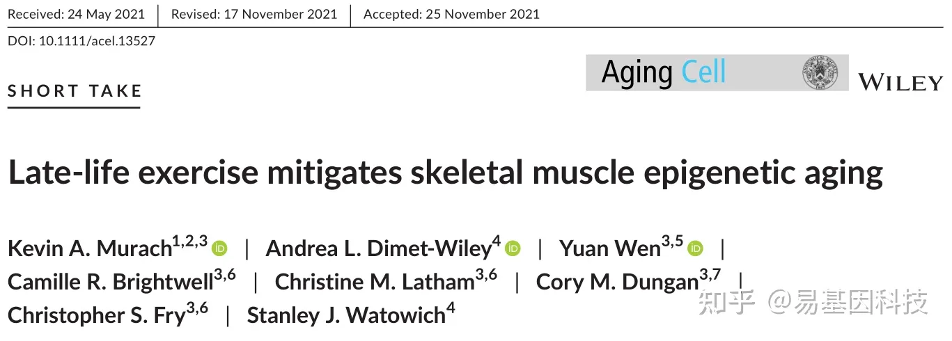 标题:Late-life exercise mitigates skeletal muscle epigenetic aging晚年锻炼延缓骨骼肌表观遗传衰老