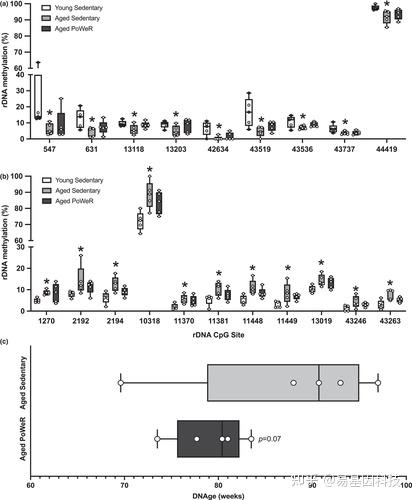(a) 与年轻小鼠相比,rDNA CpG(按染色体位置列出)在老年久坐小鼠肌肉中低甲基化(*FDR<0.05),但在老年PoWeR小鼠肌肉中未低甲基化。