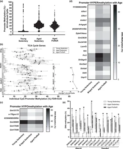 图1:年轻、老年久坐和老年渐进式负重轮跑(PoWeR)小鼠肌肉中启动子甲基化变化。