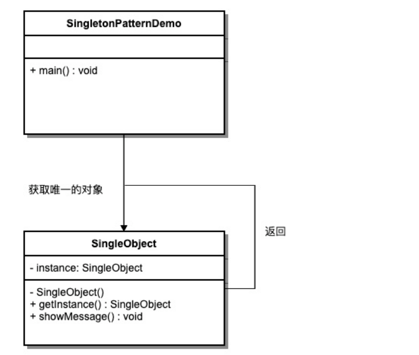 步骤2:创建 SingletonPatternDemo 类,并从 SingleObjcet 类获取唯一的对象