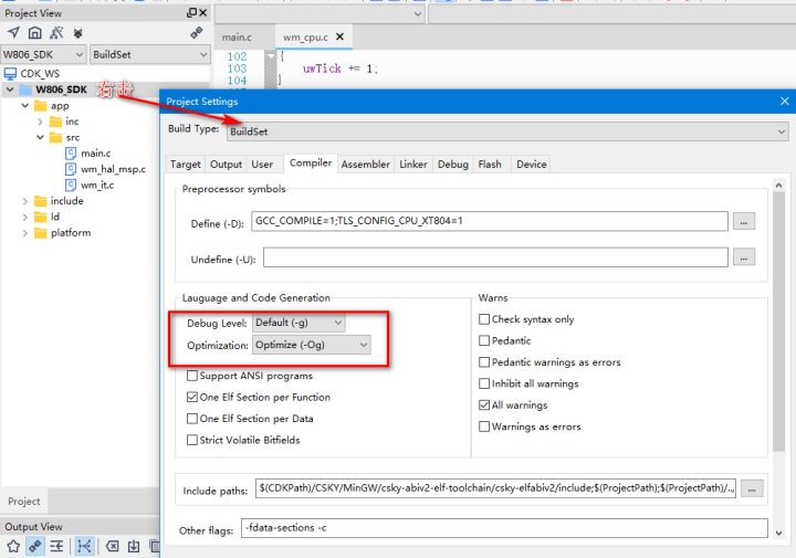 右击待编译的SDK,选择设置,如果只有1个SDK,打开菜单与前述一致,对编译器的提示等级等参数进行设置。
