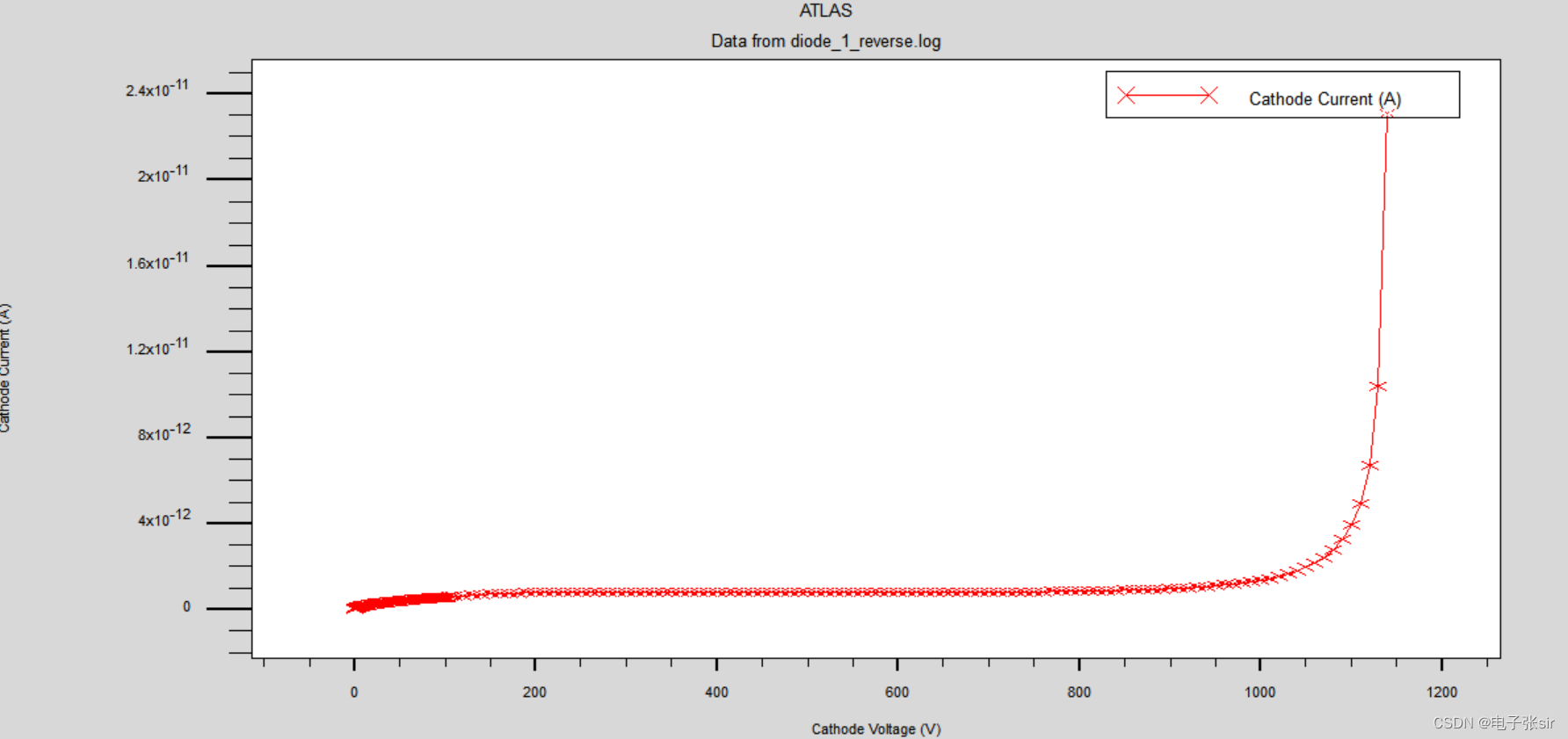 对于俩端器件PN结还有反向阻断特性,需要注意的需要加入 impact selb代表雪崩击穿时模型假设,并且最好设置截止的电流,因为我们只需要知道在何时击穿即可,一般默认器件500ua为击穿,计算其模型的击穿电流。最终得到以下图形。