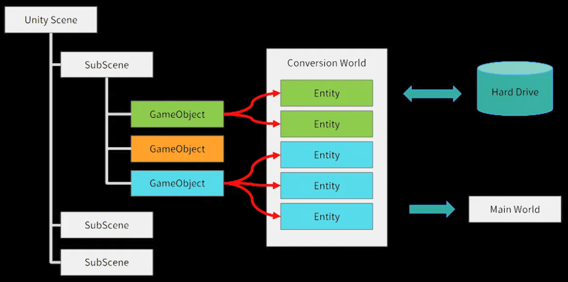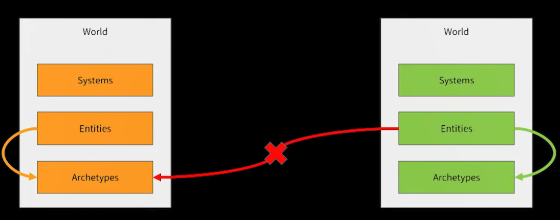 整体结构, 两个World之间是独立的, 不能别的World的child, 实体只是一个索引。