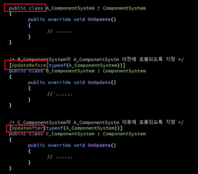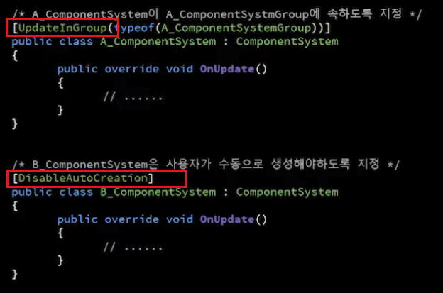 UpdateBeforeAttribute/UpdateAfterAttribute : 在系统之前或之后更新会限制ComponentSystemGroup中这些系统的调度程序排序。