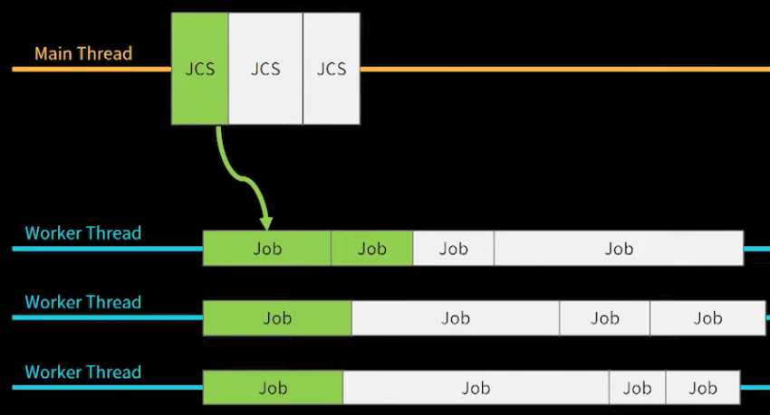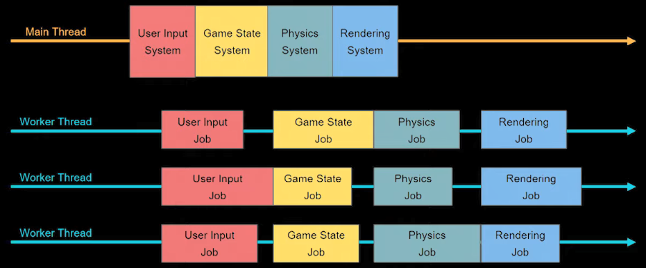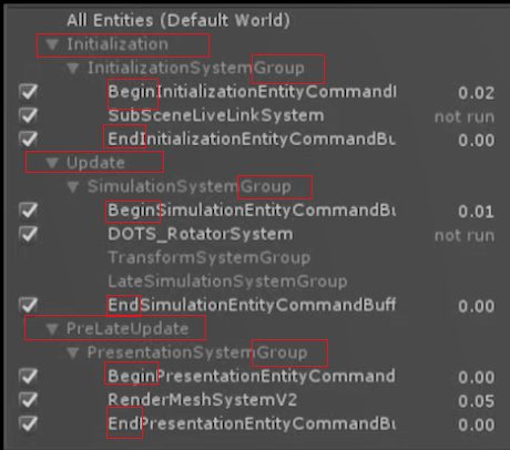下图就是这一帧之间, 比如 Position和Rotation, Rotation和 Renderer 的两个系统处理