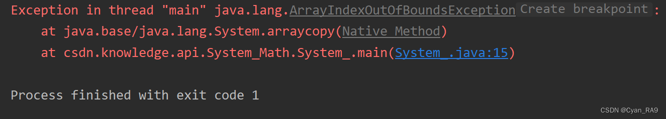①如果你的目的地数组(新数组)的长度小于你想拷贝的内容的长度,IDEA会报ArrayIndexOutOfBoundsException,如下图所示 :