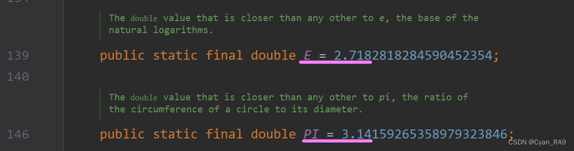 在演示Math类常用方法前,顺便提一嘴Math类的两个共有静态常量E和PI,估计大家看名字也能猜出来这是干嘛的。E是自然对数,PI是圆周率。如下图所示 :