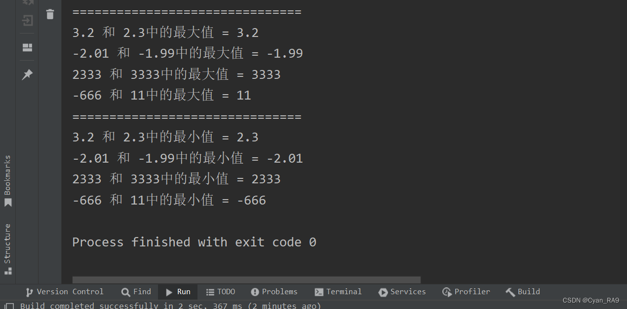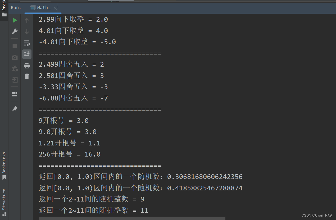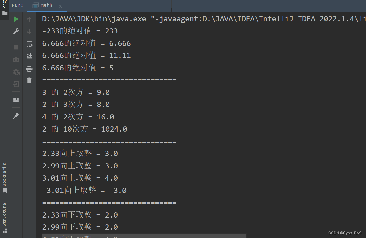 package csdn.knowledge.api.System_Math;public class Math_ {public static void main(String[] args) {//演示 : Math类常用方法//1 —— static ... abs(...)System.out.println("-233的绝对值 = " + Math.abs(-233));System.out.println("6.666的绝对值 = " + Math.abs(6.666));System.out.println("6.666的绝对值 = " + Math.abs(-11.11));System.out.println("6.666的绝对值 = " + Math.abs(5));System.out.println("===============================");//2 —— static double pow(double a, double b)System.out.println("3 的 2次方 = " + Math.pow(3, 2));System.out.println("2 的 3次方 = " + Math.pow(2, 3));System.out.println("4 的 2次方 = " + Math.pow(4, 2));System.out.println("2 的 10次方 = " + Math.pow(2, 10));System.out.println("===============================");//3 —— static double ceil(double a)System.out.println("2.33向上取整 = " + Math.ceil(2.33));System.out.println("2.99向上取整 = " + Math.ceil(2.99));System.out.println("3.01向上取整 = " + Math.ceil(3.01));System.out.println("-3.01向上取整 = " + Math.ceil(-3.01));System.out.println("===============================");//4 —— static double floor(double a)System.out.println("2.33向下取整 = " + Math.floor(2.33));System.out.println("2.99向下取整 = " + Math.floor(2.99));System.out.println("4.01向下取整 = " + Math.floor(4.01));System.out.println("-4.01向下取整 = " + Math.floor(-4.01));System.out.println("===============================");//5 —— static ... round(...)System.out.println("2.499四舍五入 = " + Math.round(2.499));System.out.println("2.501四舍五入 = " + Math.round(2.501));System.out.println("-3.33四舍五入 = " + Math.round(-3.33));System.out.println("-6.88四舍五入 = " + Math.round(-6.88));System.out.println("===============================");//6 —— static double sqrt(double a)System.out.println("9开根号 = " + Math.sqrt(9));System.out.println("9.0开根号 = " + Math.sqrt(9.0));System.out.println("1.21开根号 = " + Math.sqrt(1.21));System.out.println("256开根号 = " + Math.sqrt(256));System.out.println("===============================");//7 —— static double random()System.out.println("返回[0.0, 1.0)区间内的一个随机数:" + Math.random());System.out.println("返回[0.0, 1.0)区间内的一个随机数:" + Math.random());System.out.println("返回一个2~11间的随机整数 = " + (int) (2 + Math.random() * (11 - 2 + 1)));System.out.println("返回一个2~11间的随机整数 = " + (int) (2 + Math.random() * (11 - 2 + 1)));System.out.println("===============================");//8 —— static double random()System.out.println("3.2 和 2.3中的最大值 = " + Math.max(3.2, 2.3));System.out.println("-2.01 和 -1.99中的最大值 = " + Math.max(-2.01, -1.99));System.out.println("2333 和 3333中的最大值 = " + Math.max(2333, 3333));System.out.println("-666 和 11中的最大值 = " + Math.max(-666, 11));System.out.println("===============================");//9 —— static double random()System.out.println("3.2 和 2.3中的最小值 = " + Math.min(3.2, 2.3));System.out.println("-2.01 和 -1.99中的最小值 = " + Math.min(-2.01, -1.99));System.out.println("2333 和 3333中的最小值 = " + Math.min(2333, 3333));System.out.println("-666 和 11中的最小值 = " + Math.min(-666, 11));}