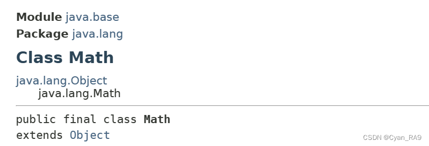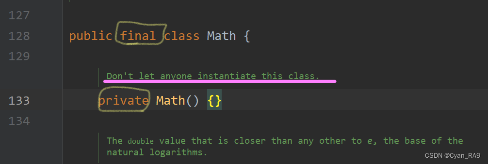 可以看到,Math类被final关键字修饰,因此Math类不可被继承。同时,Math类的构造器也被私有化了,并且源码中也给出了标注,Math类不可被实例化。