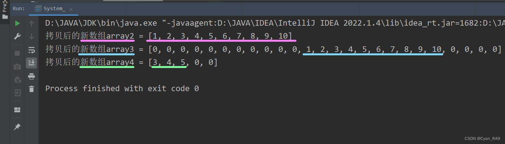 package csdn.knowledge.api.System_Math;import java.util.Arrays;public class System_ {public static void main(String[] args) {//演示 : System类常用方法//2.arraycopy()int[] array1 = new int[]{1, 2, 3, 4, 5, 6, 7, 8, 9, 10};int[] array2 = new int[array1.length];System.arraycopy(array1, 0, array2, 0, array1.length);System.out.println("拷贝后的新数组array2 = " + Arrays.toString(array2));int[] array3 = new int[25];System.arraycopy(array1, 0, array3, 11, 10);System.out.println("拷贝后的新数组array3 = " + Arrays.toString(array3));int[] array4 = new int[5];System.arraycopy(array1, 2, array4, 0, 3);System.out.println("拷贝后的新数组array4 = " + Arrays.toString(array4));}