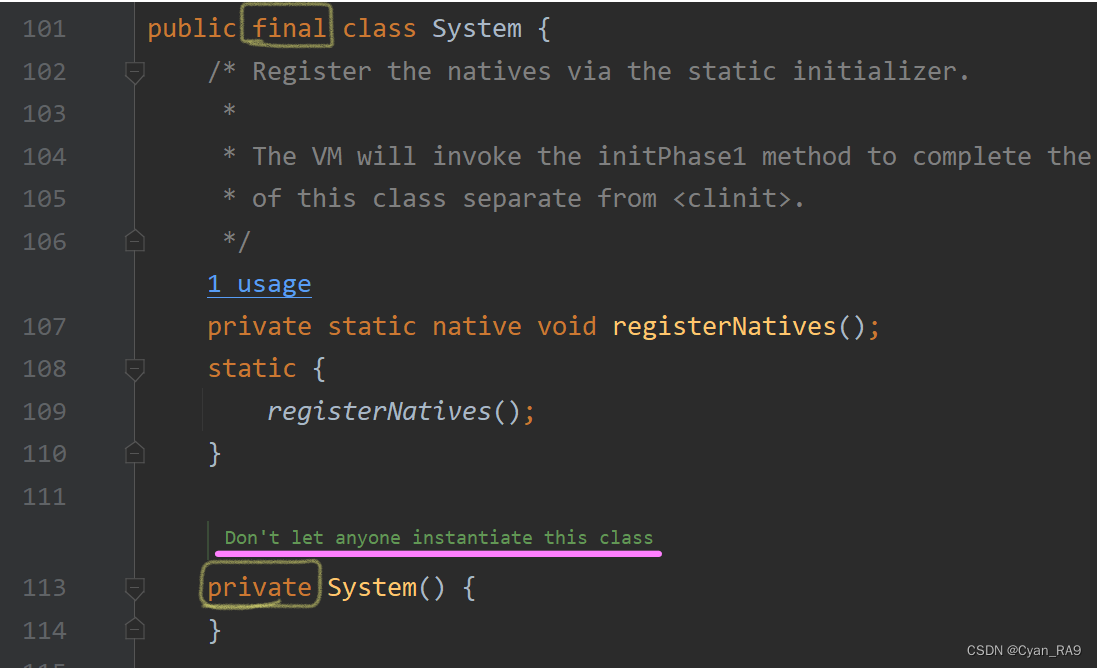同样,System类不可被继承(final修饰),不可被实例化(构造器私有)。