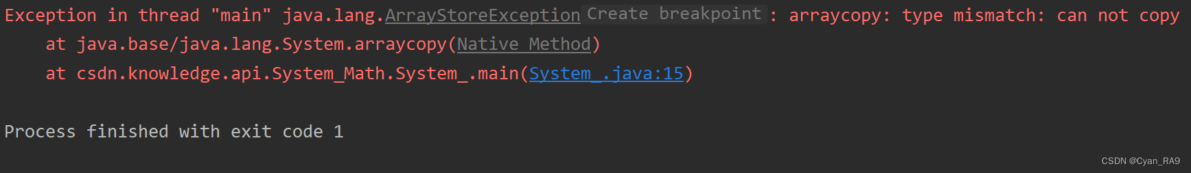 ②如果原数组与新数组类型不兼容,IDEA会报ArrayStoreException,如下图所示 :