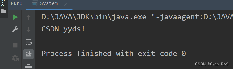 package csdn.knowledge.api.System_Math;public class System_ {public static void main(String[] args) {//演示 : System类常用方法//1.exit()System.out.println("CSDN yyds!");System.exit(0);System.out.println("这句话能否输出?");}