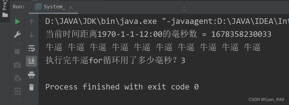 package csdn.knowledge.api.System_Math;import java.util.Arrays;public class System_ {public static void main(String[] args) {//演示 : System类常用方法//3.currentTimeMillis()Long time_Start = System.currentTimeMillis();System.out.println("当前时间距离1970-1-1-12:00的毫秒数 = " + time_Start);for (int i = 0; i < 10; i++) {System.out.print("牛逼 ");}Long time_End = System.currentTimeMillis();System.out.println("\n执行完牛逼for循环用了多少毫秒?" + (time_End - time_Start));}