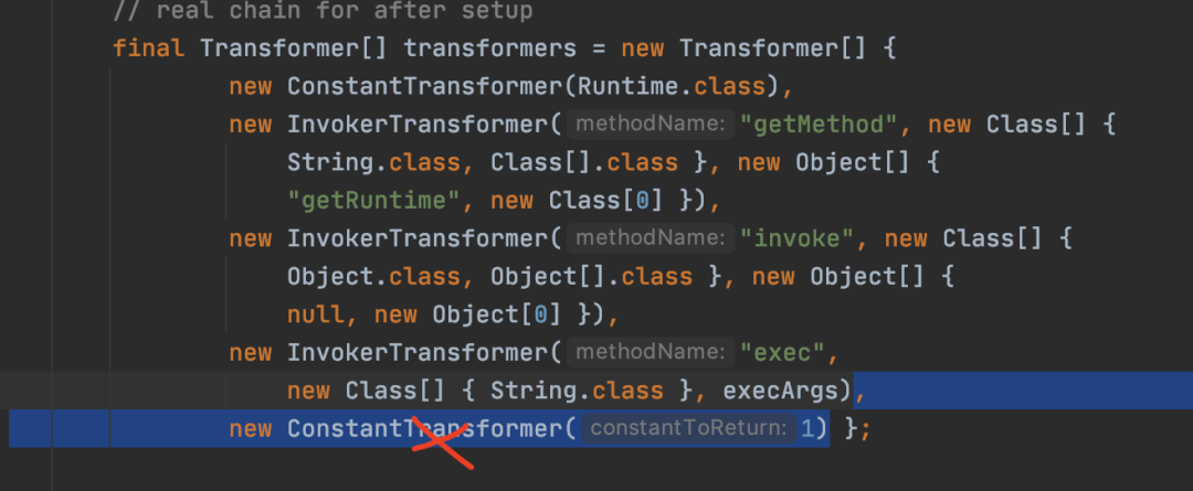 这意味着我们是能够控制这个参数,漏洞利用的最需要的就是参数可控,这里就满足了,继续看会发现有一个ConstantTransformer以及三个InvokerTransformer是处于同一级别的,从payload可以看出来他们被放在了前面说的参数可控的数组内: