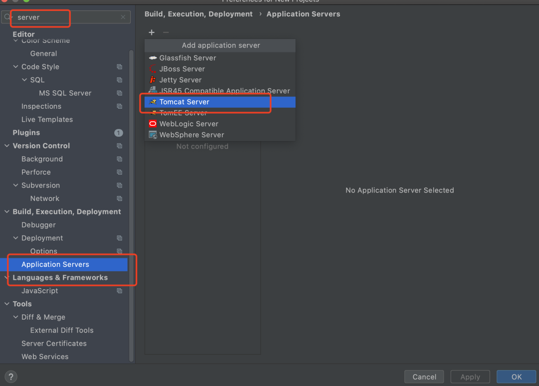 找到偏好设置之后搜索server,如下图找到application servers,选择+号新增一个tomcat服务器。