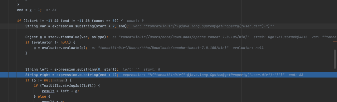 但此时并没有停止解析,而是递归的解析了我们恶意的ognl表达式,此时我们将得到: