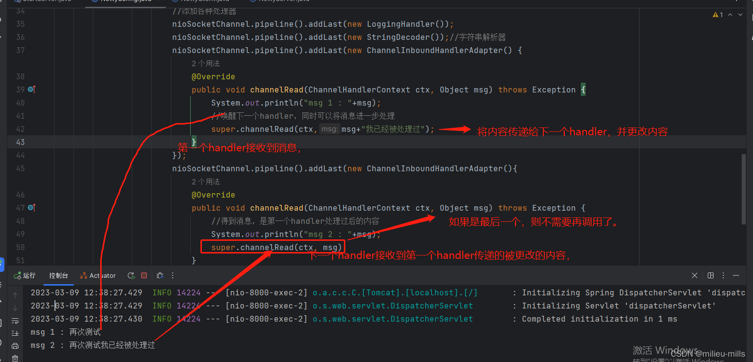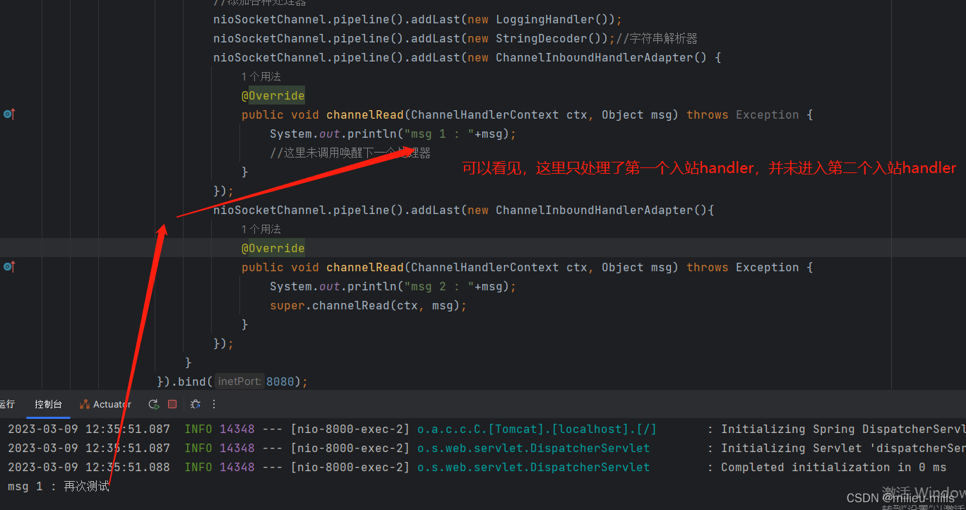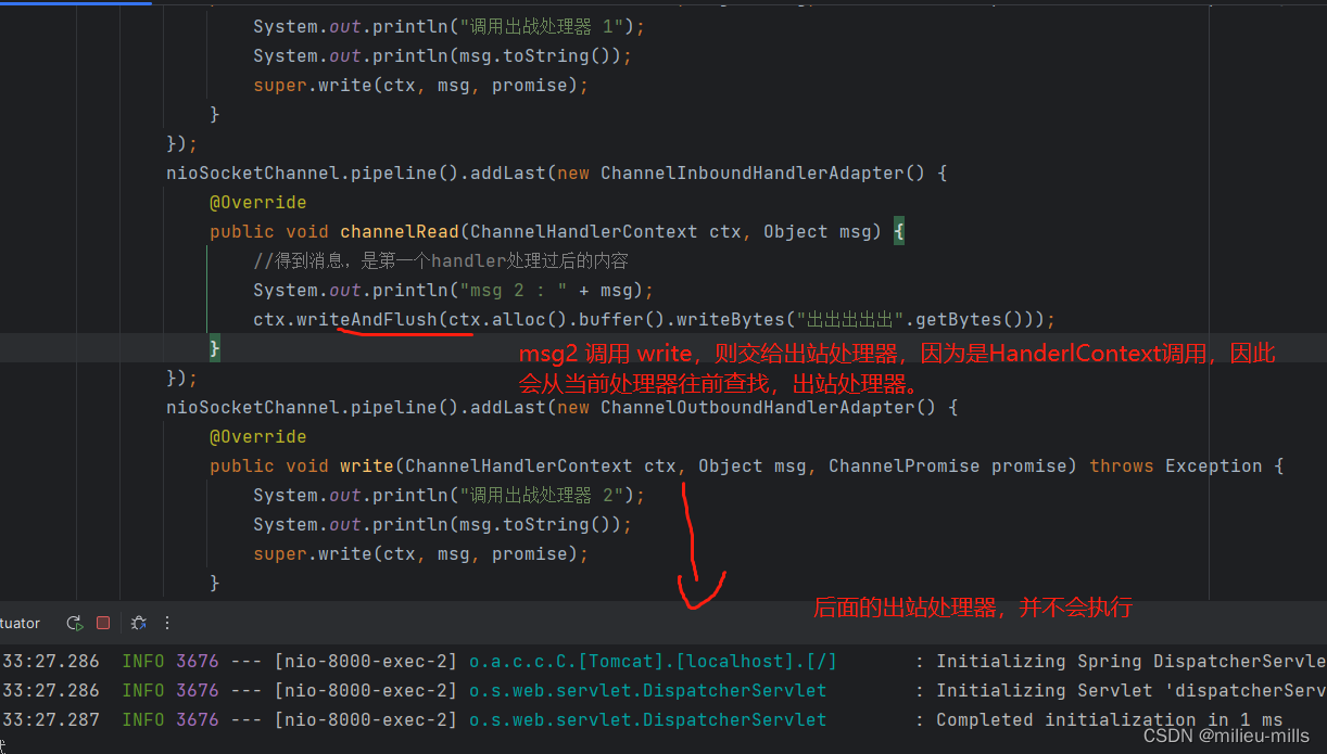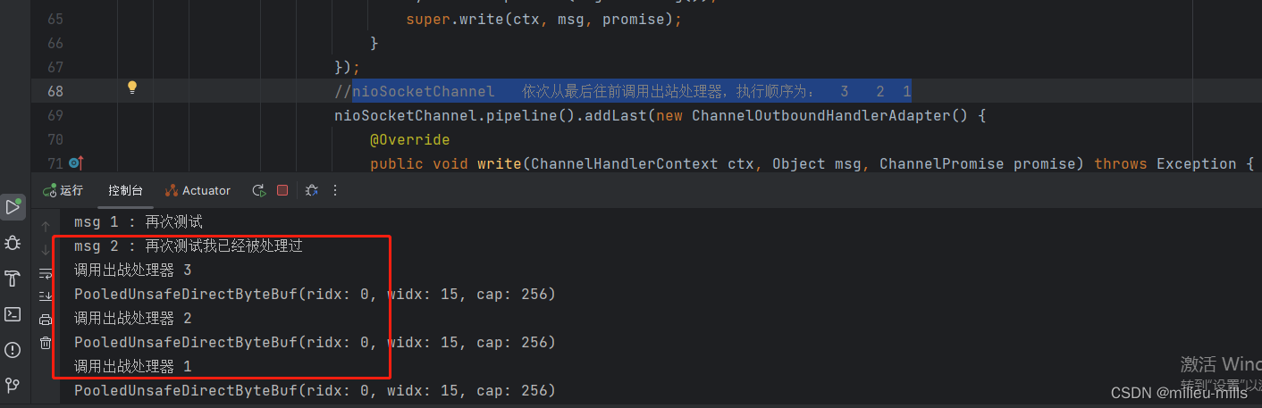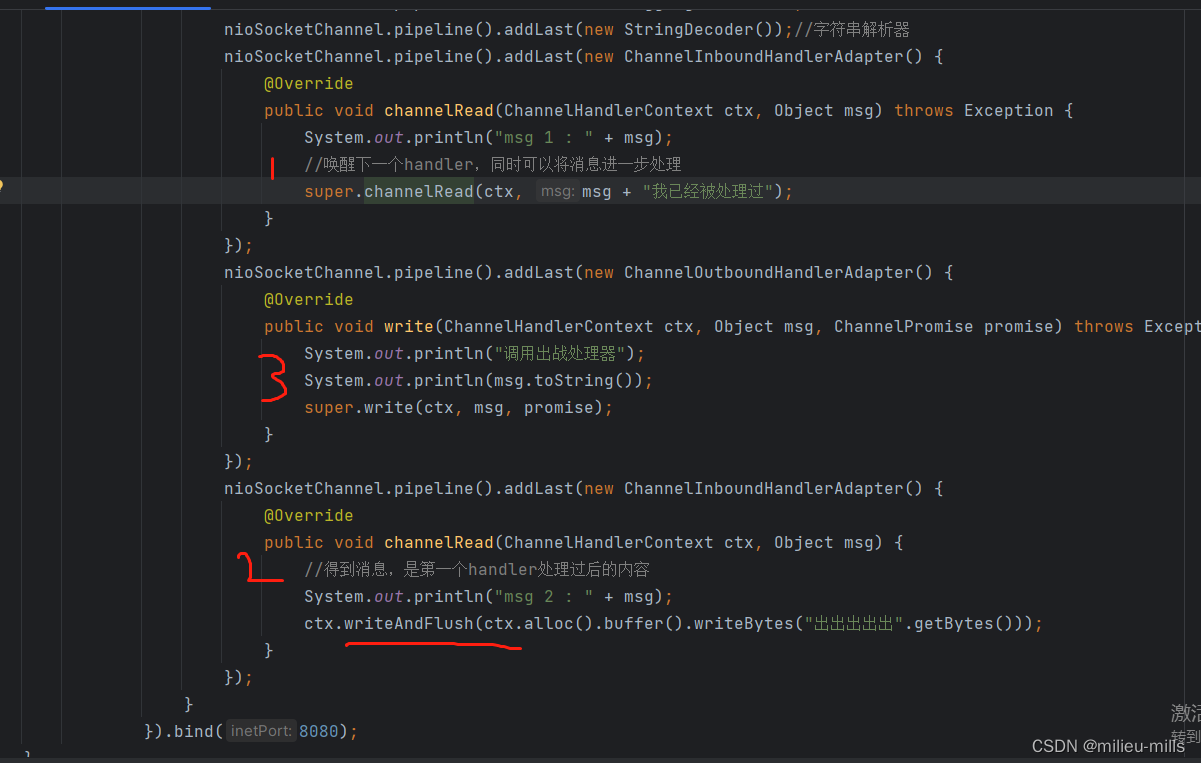nioSocketChannel.pipeline().addLast(new ChannelInboundHandlerAdapter() {@Overridepublic void channelRead(ChannelHandlerContext ctx, Object msg) throws Exception {System.out.println("msg 1 : " + msg);//唤醒下一个handler,同时可以将消息进一步处理super.channelRead(ctx, msg + "我已经被处理过");}});nioSocketChannel.pipeline().addLast(new ChannelOutboundHandlerAdapter() {@Overridepublic void write(ChannelHandlerContext ctx, Object msg, ChannelPromise promise) throws Exception {System.out.println("调用出战处理器 1");System.out.println(msg.toString());super.write(ctx, msg, promise);}});nioSocketChannel.pipeline().addLast(new ChannelInboundHandlerAdapter() {@Overridepublic void channelRead(ChannelHandlerContext ctx, Object msg) {//得到消息,是第一个handler处理过后的内容System.out.println("msg 2 : " + msg);//ctx.writeAndFlush(ctx.alloc().buffer().writeBytes("出出出出出".getBytes()));//nioSocketChannel 会从最后一个依次向前找出站处理器nioSocketChannel.writeAndFlush(ctx.alloc().buffer().writeBytes("出出出出出".getBytes()));}});nioSocketChannel.pipeline().addLast(new ChannelOutboundHandlerAdapter() {@Overridepublic void write(ChannelHandlerContext ctx, Object msg, ChannelPromise promise) throws Exception {System.out.println("调用出战处理器 2");System.out.println(msg.toString());super.write(ctx, msg, promise);}});nioSocketChannel.pipeline().addLast(new ChannelOutboundHandlerAdapter() {@Overridepublic void write(ChannelHandlerContext ctx, Object msg, ChannelPromise promise) throws Exception {System.out.println("调用出战处理器 3");System.out.println(msg.toString());super.write(ctx, msg, promise);}});}