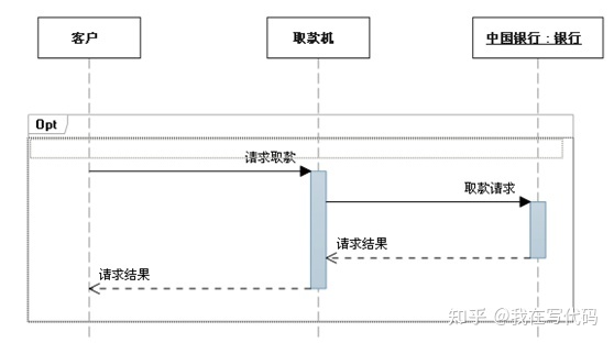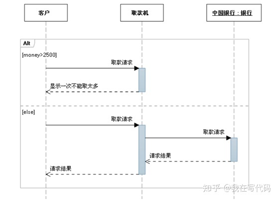 抉择用来指明在两个或更多的消息序列之间的互斥的选择,抉择在任何场合下只发生一个序列。注意Alt方框中间的虚线,虚线把Alt分两部分,只执行虚线上面或者虚线下面其中之一。