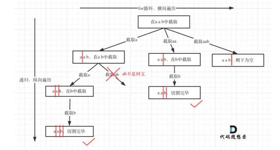 class Solution {List> res = new ArrayList<>();LinkedList path = new LinkedList<>();public List> partition(String s) {back(s, 0);return res;}// 递归函数参数private void back(String s, int startIndex) {// 终止条件if (startIndex >= s.length()){res.add(new ArrayList<>(path));return;}for (int i = startIndex; i < s.length(); i++){// 如果是回文子串就path.addif (isPalindrome(s, startIndex, i)){path.add(s.substring(startIndex, i + 1));}elsecontinue;back(s, i + 1);path.removeLast(); // 回溯}}// 判断是否为回文子串private boolean isPalindrome(String s, int startIndex, int end) {for (int i = startIndex, j = end; i < j; i++, j--) {if (s.charAt(i) != s.charAt(j)) {return false;}}return true;}