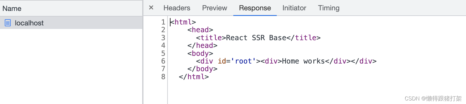 import App from '../share/pages/App'export default req => {// StaticRouter根据请求req的 url 匹配对应的路由获取页面组件渲染成字符串const content = renderToString( )return `React SSR Base ${content}`