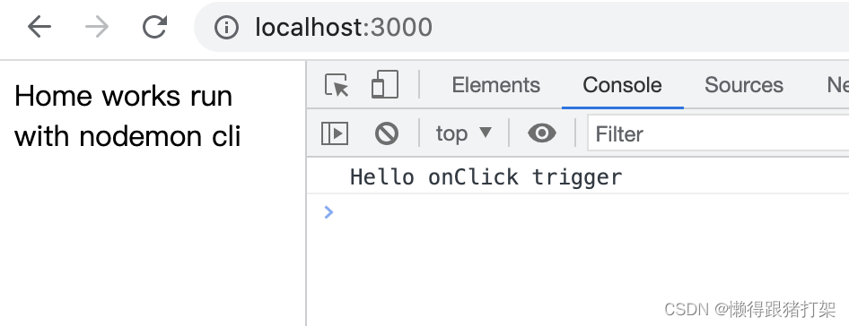 export default function Home () {return (<> console.log('Hello onClick trigger')}>Home works run with nodemon cli{' '}navigate to list page>)