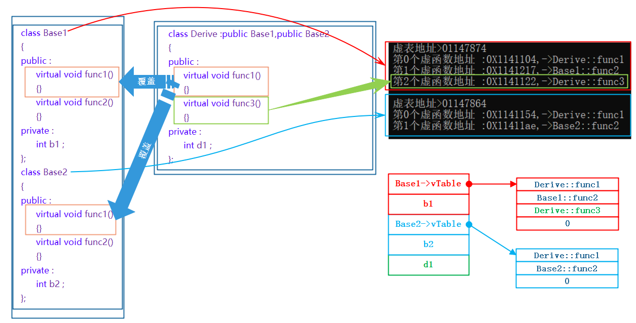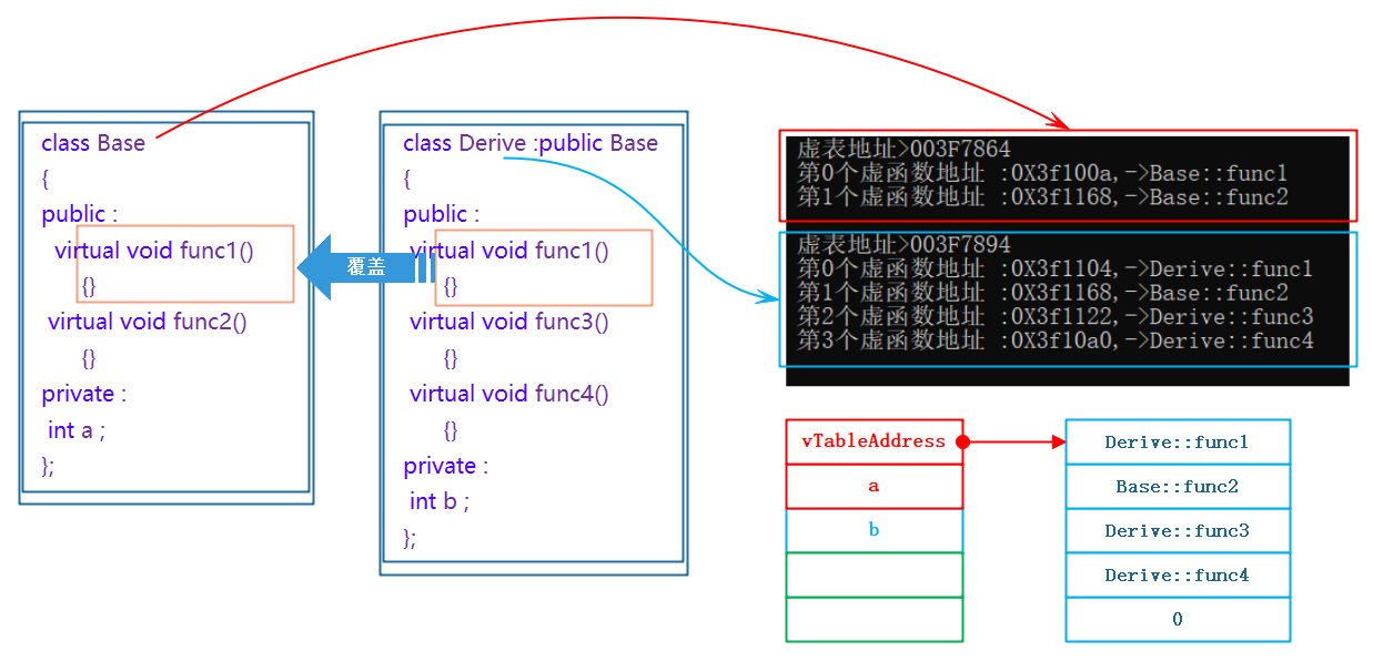 中存的是重写的Derive::Func1,所以虚函数的重写也叫作覆盖,覆盖就是指虚表中虚函数的覆盖。重写是语法的叫法,覆盖是原理层的叫法。