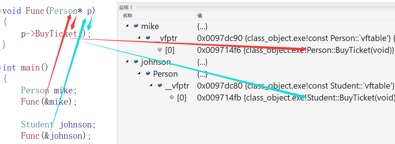 2. 观察下图的蓝色箭头我们看到,p是指向johnson对象时,p->BuyTicket在johson的虚表中找到虚函Student::BuyTicket。